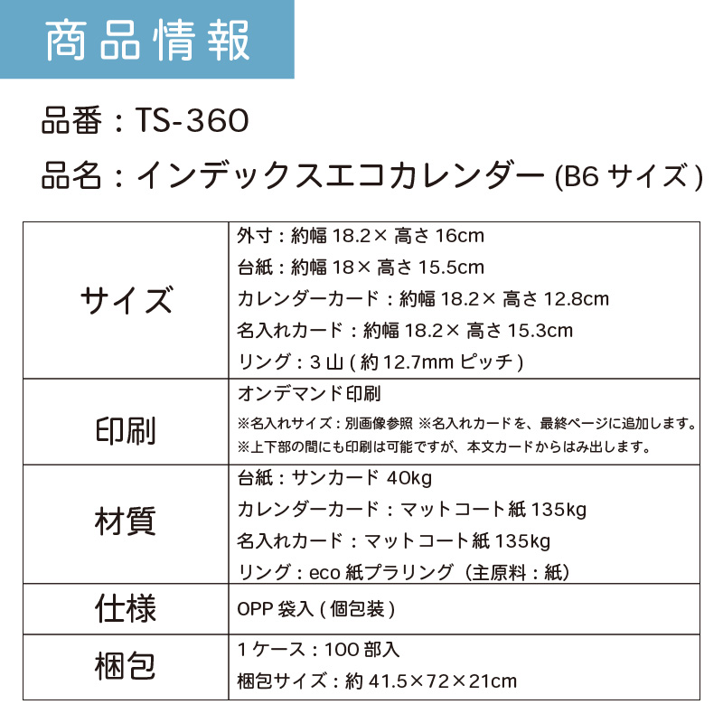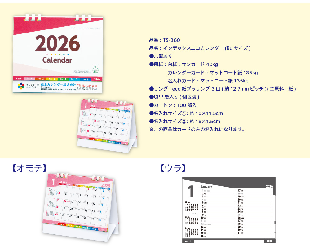 ※2025年完売※カレンダー 2026年 B6サイズ 名入れ 1色 フルカラー 全面印刷 インデックスエコカレンダー 幅18cm 高さ16cm | 100部 200部 300部 400部 500部卓上カレンダー オンデマンド印刷 年末年始 ご挨拶 令和8年 オリジナル 社名 団体名 企業名 環境配慮 TS-360